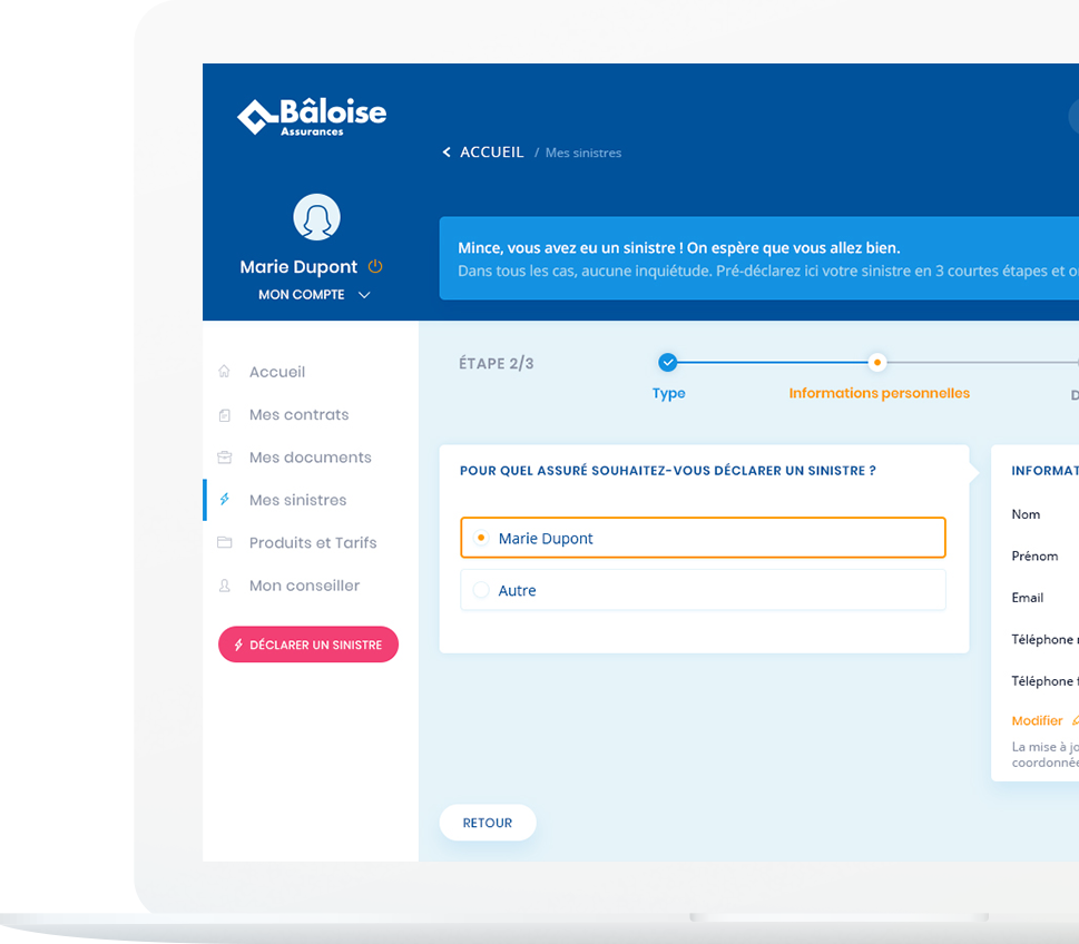 Créer une plateforme pour permettre aux particuliers de voir et modifier leurs contrats, de trouver rapidement un contact ou encore de déclarer un sinistre en ligne, c’était la partie « facile » du brief. Le vrai challenge consistait à penser un outil qui soit certes utile en cas de besoin, mais qu’on ait aussi envie de consulter pour avoir des conseils, comprendre un produit d’assurance maison, auto ou vacances, ou encore dialoguer avec son conseiller.